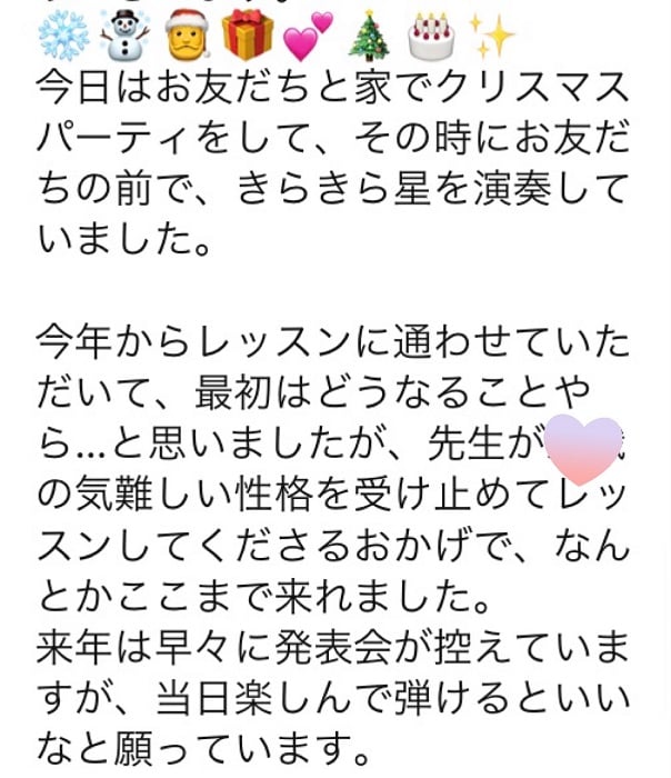 とってもシャイなYちゃんが、お友達の前できらきら星を演奏したというお話に感動してしまいました!